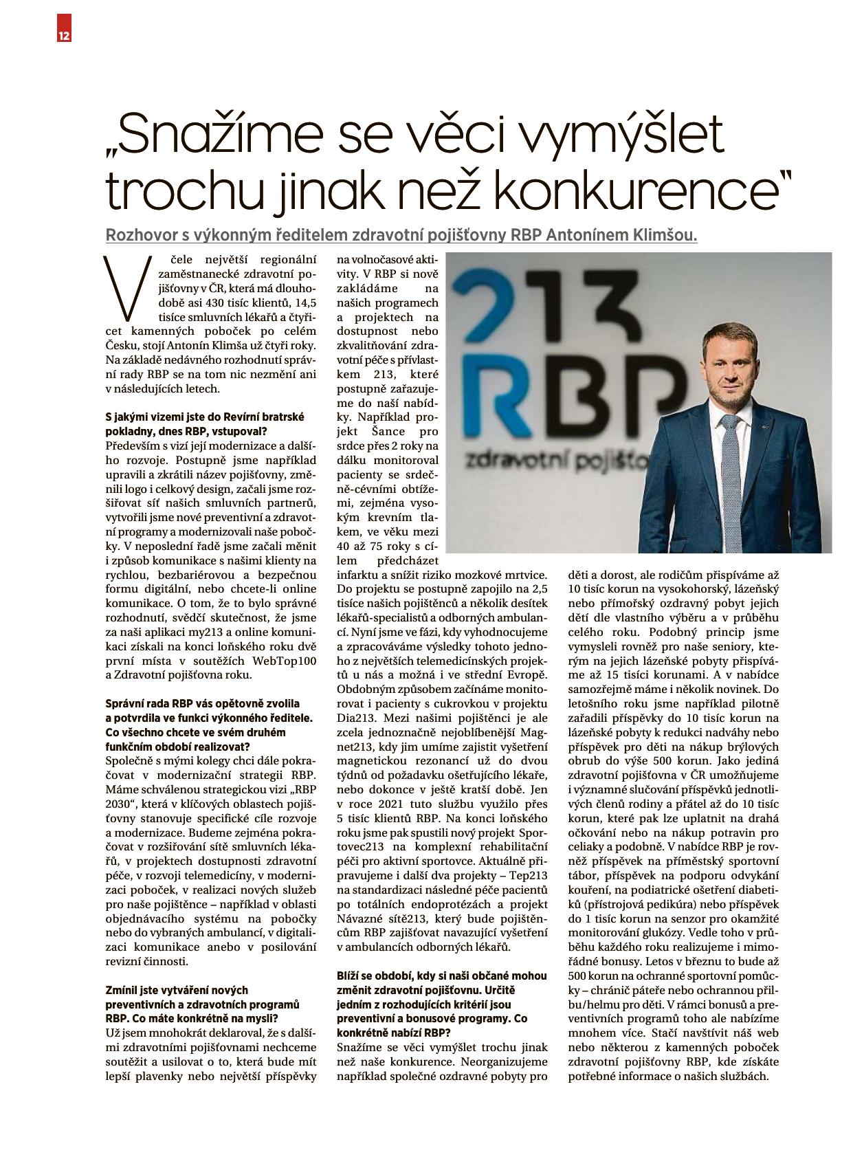Už jsem mnohokrát deklaroval, že s dalšími zdravotními pojišťovnami nechceme soutěžit a usilovat o to, která bude mít lepší plavenky nebo největší příspěvky na volnočasové aktivity. V RBP si nově zakládáme na našich programech a projektech na dostupnost nebo zkvalitňování zdravotní péče s přívlastkem 213, které postupně zařazujeme do naší nabídky. Například projekt Šance pro srdce přes 2 roky na dálku monitoroval pacienty se srdečně-cévními obtížemi, zejména vysokým krevním tlakem ve věku mezi 40 - 75 roky s cílem předcházet infarktu a snížit riziko mozkové mrtvice. Do projektu se postupně zapojilo na 2,5 tisíce našich pojištěnců a několik desítek lékařů-specialistů a odborných ambulancí. Nyní jsme ve fázi, kdy vyhodnocujeme a zpracováváme výsledky tohoto jednoho z největších telemedicínských projektů u nás a možná i ve střední Evropě. Obdobným způsobem začínáme monitorovat i pacienty s cukrovkou v projektu Dia213. Mezi našimi pojištěnci je ale zcela jednoznačně nejoblíbenější Magnet213, kdy jim umíme zajistit vyšetření magnetickou rezonancí už do dvou týdnů od požadavku ošetřujícího lékaře nebo dokonce v ještě kratší době. Jen v roce 2021 tuto službu využilo přes 5 tisíc klientů RBP. Na konci loňského roku jsme pak spustili nový projekt Sportovec213 na komplexní rehabilitační péči pro aktivní sportovce. Aktuálně připravujeme i další dva projekty - Tep213 na standardizaci následné péče pacientů po totálních endoprotézách a projekt Návazné sítě213, který bude pojištěncům RBP zajišťovat navazující vyšetření v ambulancích odborných lékařů.