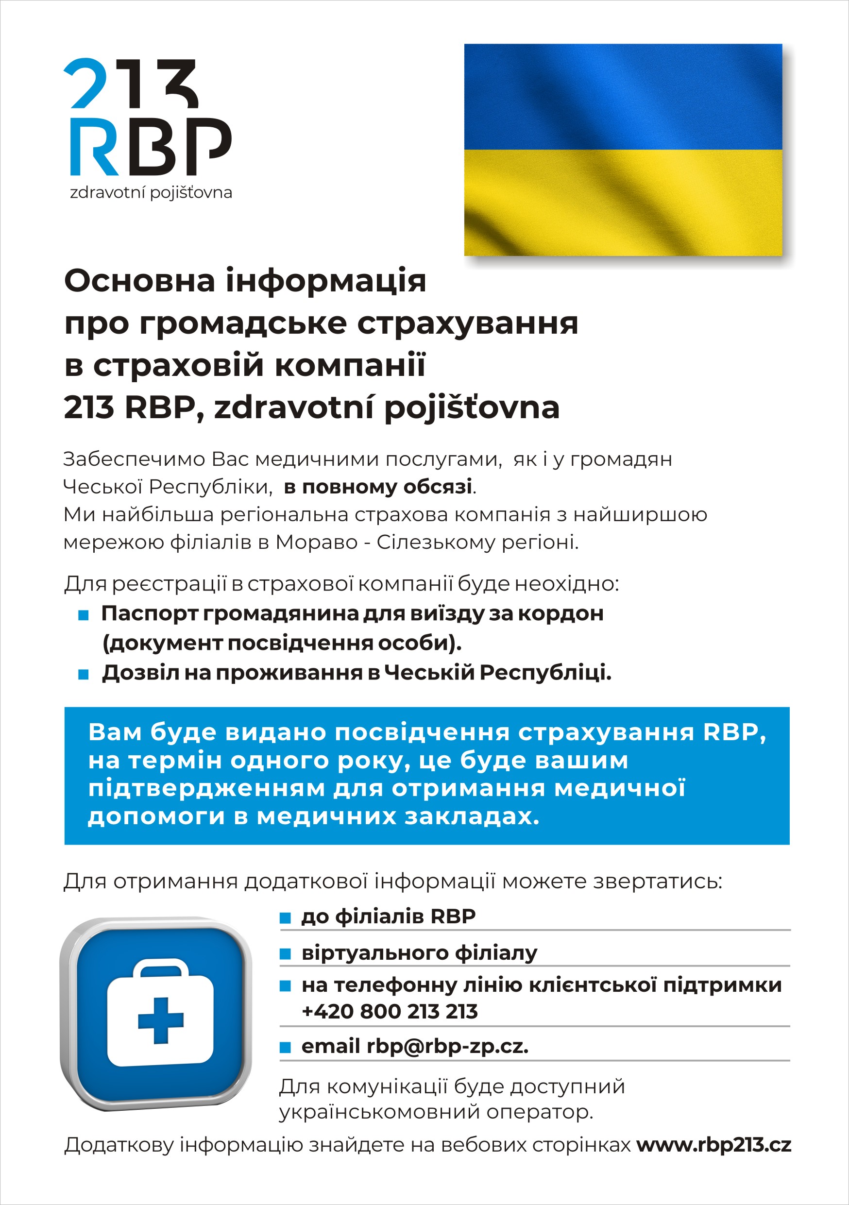 Громадяни України, які тікають від війни у своїй країні та отримують візу в Чехії, можуть зареєструватися в медичній страховій компанії RBP з 1 березня 2022 року.