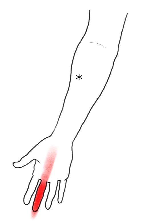 Jsou uloženy v hloubce na dlaňové straně předloktí a přetěžují se více při činnostech, které vyžadují stisk ruky, kroutivé pohyby, než při činnostech s počítačem. Bolest je na vnitřní části lokte a předloktí, dlaně.