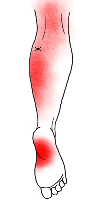 Postavte se čelem ke stěně a opřete se o ni rukama. Neprotahovanou dolní končetinu pokrčte v kyčli a v koleni, zanožte protahovanou dolní končetinu a opřete ji o celé chodidlo – špička směřuje ke stěně. Koleno držte natažené po celou dobu cvičení! Protažení svalu zvětšíte přibližováním trupu ke stěně (patu držte stále na podložce). Aktivace svalu dosáhnete nadzvednutím paty od podložky.
